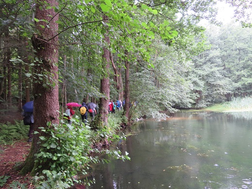 Entlang des Märzenbecherrundweges führte der Weg vorbei an typischen Landschafts-bestandteilen dieses Schutzgebietes, wie Hainsimsen-Buchenwäldern, Schlucht- und Hangmischwäldern und einigen imposanten Silikatfelsen. Im Tal, an der Polenz angekommen, öffnete sich die Aue mit ihren Flachland-Mähwiesen und bachbegleitenden Hoch-staudenfluren. Der naturnahe Lauf des kleinen Fließgewässers, seine Windungen und strukturreichen Ufer mit hoher Artenvielfalt begleitete die Gruppe bis zum Ziel zurück an der Bockmühle. Gerhard Steiner, Naturfreund und bestens mit den Gegebenheiten vor Ort vertraut, erzählte, ergänzt von weiteren Ortskundigen, viel Wissenswertes zu hier vorkommenden Tierarten, wie dem Biber, Fischotter oder Lachs. Die Entwicklung der Pflanzenwelt im Tal und Interessantes zu den bewaldeten Hängen, Felsen und weiten Auen im oberen Polenztal war ein weiterer Schwerpunkt der interessanten Ausführungen.